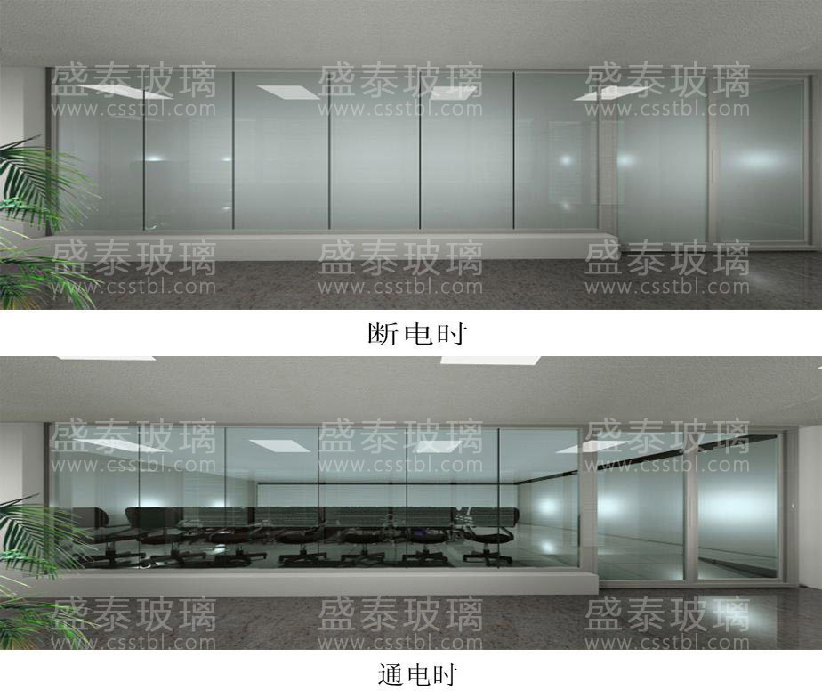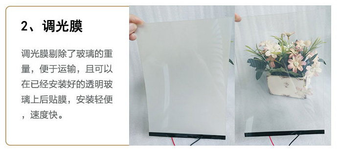 工作原理当调光玻璃关闭电源时,电控调光玻璃里面的液晶分子会呈现不规则的散布状态,此时电控玻璃呈现透光而不透明的外观状态;当给调光玻璃通电后,里面的液晶分子呈现整齐排列,光线可以自由穿透,此时调光玻璃瞬间呈现透明状态。